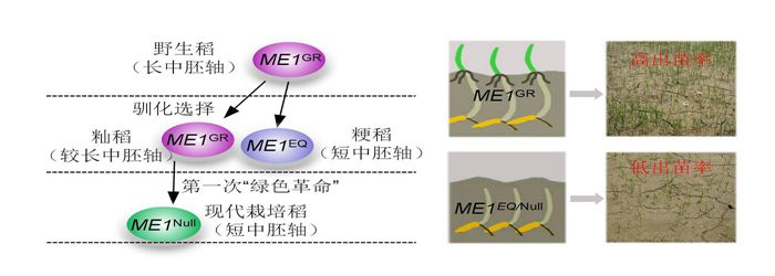 研究人员实验表明, qME1 基因座对应的就是水稻“绿色革命”中矮化育种发掘出的重要基因 SD1 ,也正是该基因在“绿色革命”前赋予了水稻长中胚轴性状。进一步研究发现,水稻覆土机械压力通过诱导释放乙烯,最终促进水稻中胚轴伸长。驯化研究发现,中胚轴伸长性状在矮化育种中逐渐丢失,也暗示长中胚轴是野生稻及“绿色革命”前水稻在破土出苗时适应恶劣环境的关键因素之一。此外,该研究还发现相关基因具有耐淹、早生快发等优点,中胚轴部位异位表达该基因能在不显著影响水稻株高和抗倒伏性的前提下促进中胚轴伸长。