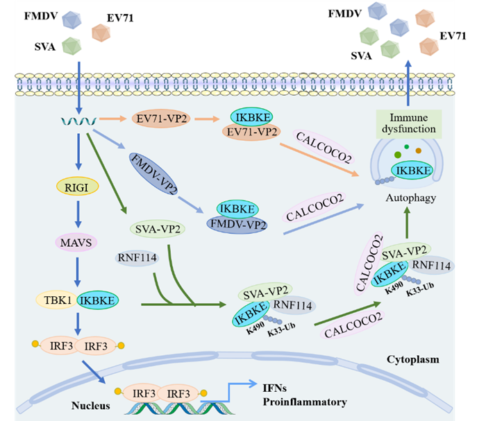 该研究发现,小RNA病毒VP2蛋白如同一个“免疫破坏者”,在病毒感染过程中发挥关键的抑制免疫反应的作用。该蛋白优先与细胞内的特定自噬受体结合,识别被“特殊修饰”过的免疫信号分子,然后将其送入细胞的自噬降解系统进行清除。该发现为小RNA病毒疫苗,以及抗病毒、抗肿瘤疗法的开发提供了新思路。