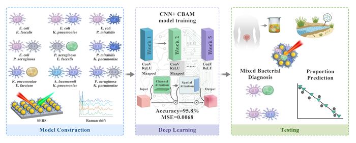 该研究构建了一种可解释性的表面增强拉曼光谱-人工智能联合分析平台,实现了多种病原菌的高精度识别,准确率达95.8%,并可精准识别混合样本细菌的比例。该研究成果不仅为农业环境中病原菌的快速精准检测提供了高效可行的技术路径,其构建的“表面增强拉曼光谱-人工智能”分析体系也为复杂微生物群落的智能化检测与机制解析开辟了新思路。