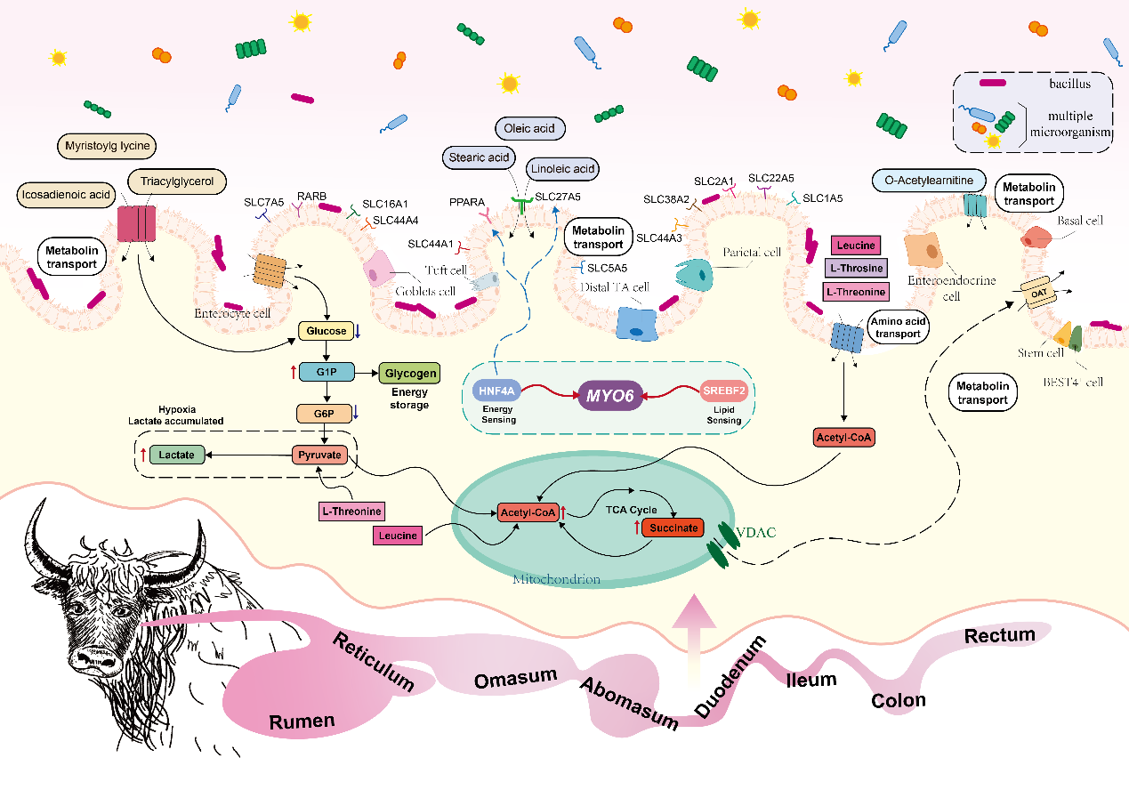 科研团队构建了首个牦牛胃肠道单细胞图谱,包含117,019个高质量细胞,涵盖54种细胞类型。通过整合单细胞转录组、宏基因组和代谢组数据,研究发现牦牛胃肠道特异性转录因子HNF4A和SREBF2通过调节糖原储备和糖酵解过程,在低氧环境中维持能量稳态。同时,研究揭示了胃肠道微生物与宿主的协同进化关系,这些微生物作为“能量转换器”,帮助牦牛从有限饲草中获取更多营养。