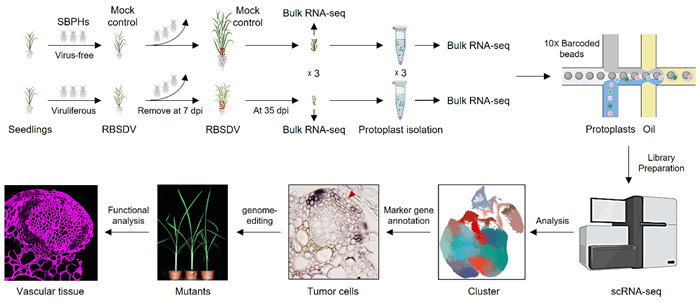 该研究通过单细胞转录组测序绘制了含有12种细胞类型的水稻叶鞘单细胞转录图谱。发现感染水稻黑条矮缩病毒的水稻,其维管组织细胞沿着韧皮部向外扩张形成肿瘤细胞。在分化过程中,参与DNA复制等生物学过程的基因显著上调,而参与光合作用及能量代谢等过程的相关基因表达被显著抑制。同时鉴定到一个茉莉酸诱导的病程相关基因JiPR10,该基因通过抑制肿瘤细胞形成和病毒积累增强寄主抗病性。该研究首次揭示了水稻感染病毒后在单细胞水平上的基因表达变化,为植物病毒致病机制研究提供了新思路和数据资源。