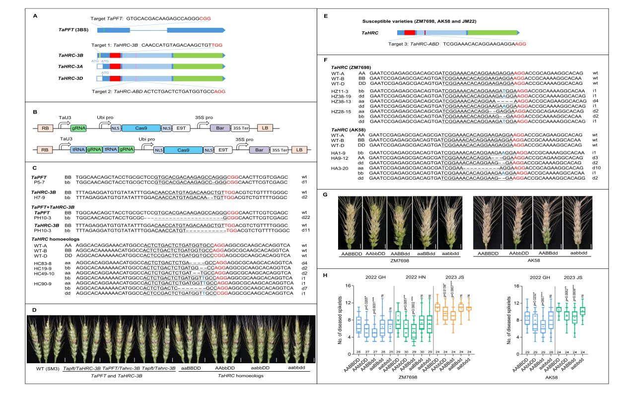 研究团队利用基因编辑技术,在抗病品种“苏麦3号”中单独和同时敲除TaPFT和TaHRC两个基因。抗病鉴定结果表明单独或同时突变两个基因,均不能引起其抗性改变,说明TaPFT基因不具有抗病功能。同时,在三个感病品种中构建了TaHRC及其同源基因的突变体。结果表明,“郑麦7698”和“矮抗58” 的Tahrc-3B和Tahrc-3D突变体能够显著提高赤霉病抗性,其中Tahrc-3D提高更为显著。但在“济麦22”中,不同类型的TaHRC突变体均未能提高抗性。该研究揭示了TaHRC基因调控赤霉病感病性的复杂特性,同时创制了一个与Tahrc-3B突变相比,具有更高抗性的等位基因Tahrc-3D,为深入研究Fhb1介导的赤霉病抗性机制和利用Fhb1进行小麦抗赤霉病育种,提供了新材料和新视角。