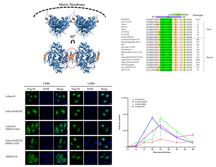 基质蛋白是新城疫病毒的重要结构蛋白,具有在细胞核和细胞质中穿梭的特性。然而,对于基质蛋白核质穿梭的机制,尤其是其出核“行为”对病毒的作用仍不清楚。