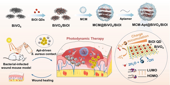 该纳米喷雾以可见光响应的铋基杂化纳米颗粒为核心,表面包覆仿生巨噬细胞膜,外壳负载特异识别致病菌的核酸适配体。可见光照射激发纳米喷雾产生大量活性氧自由基,迅速穿透并破坏细菌细胞膜,实现高效精准杀菌。同时,仿生膜结构使材料具有良好的稳定性与生物膜表面黏附能力,利于药效长效维持、减少流失。研究表明,纳米喷雾对金黄色葡萄球菌、大肠杆菌等典型病原菌杀灭率超99%。该研究揭示了光照纳米颗粒产生活性氧的机制,验证了其低氧环境下依然高效杀菌的优势,解决了传统光动力材料在实际应用中“氧依赖性”的关键限制。
