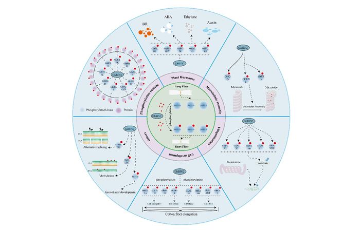 近日,中国农业科学院棉花研究所和西部农业研究中心合作,系统解析了蛋白激酶GhBIN2通过磷酸化级联反应负调控棉花纤维伸长的调控网络和分子机制,为棉花纤维品质改良提供了新靶点。相关研究成果发表在《植物生物技术杂志(Plant Biotechnology Journal)》上。