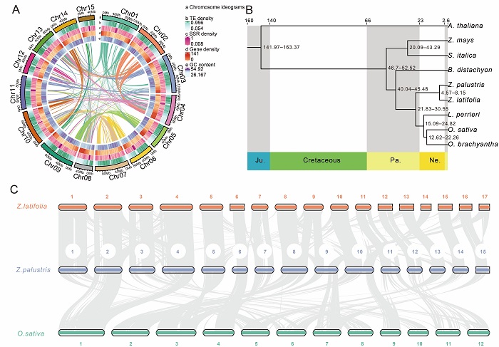 该研究组装获得1.41Gb的北美沼生菰基因组,长末端重复组装指数为29.9。通过序列连接填充,将99.99%的组装序列锚定至15条染色体。研究发现,北美沼生菰与中国菰亲缘关系最近,两者分化时间为4.57–8.15 百万年前,均经历全基因组复制,且存在明显的物种分化信号。该研究鉴定出两个与水稻植保素基因簇高度共线性的区段,其在北美沼生菰与中国菰基因组中均存在2个拷贝,由全基因组复制而来,并伴随着基因组片段化。