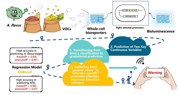 研究针对黄曲霉侵染玉米、花生后释放的特征性有机挥发物,筛选出8个特异性诱导表达基因,构建了8种大肠杆菌发光菌株,形成全新的全细胞生物传感器阵列。该阵列结合多种机器学习回归模型,实现了对霉变天数和黄曲霉毒素B₁含量的精准预测,预测准确率分别达94%和98%,并且独立菌株展现出良好泛化能力,验证了该技术在不同基质和菌株中的稳健性。该技术为粮油食品中真菌及毒素风险监测提供了创新性的解决方案。