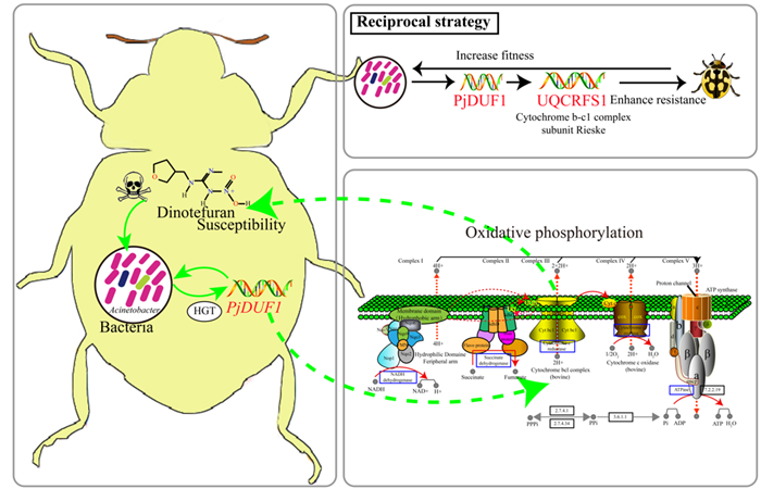该研究从龟纹瓢虫的一类肠道微生物不动杆菌中获得了一个细菌来源的水平转移基因PjDUF1。研究发现,当面对杀虫剂胁迫时,龟纹瓢虫体内肠道微生物介导该基因高表达。该基因通过结合线粒体中的蛋白质亚基,调控腺苷三磷酸合成速率,从而增强宿主的耐药性。研究结果首次证实了水平转移基因在天敌昆虫中可进化出全新的生物学功能,提出的“微生物-基因-宿主”互作模型,揭示了自然界中“授人以渔”式的精妙共生关系,为开发新型害虫防控策略提供了理论依据。