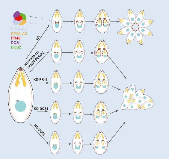 科研团队揭开了其中的奥秘:蛋白磷酸酶PP2A-2是调控弓形虫速殖子阶段子代从母体顺利脱出的“关键开关”,通过精准调控特定蛋白的磷酸化状态,确保子代按序从母体分离,开启新的繁殖周期。一旦这个“开关”功能受损,子代无法正常释放,出现聚集、粘连及形态异常,就会导致增殖受阻。这一发现为后续研究提供了一个精准的“抗虫靶点”,为研发靶向阻断弓形虫增殖的新药提供重要依据。