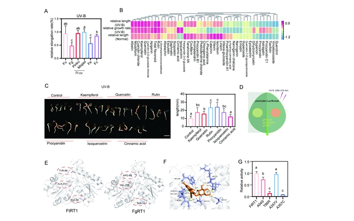 研究团队通过全基因组关联分析,鉴定到荞麦中黄酮类代谢物芦丁、异槲皮苷和山奈酚合成的3个关键基因,过表达这些基因可显著提高荞麦黄酮类代谢物含量和耐中波紫外线辐射能力。进一步研究发现,这些基因启动子活性在栽培种和野生种间差异较大,进而影响基因的转录水平,最终导致黄酮类代谢物合成的差异。该研究为荞麦耐逆分子育种提供理论基础和重要靶点。