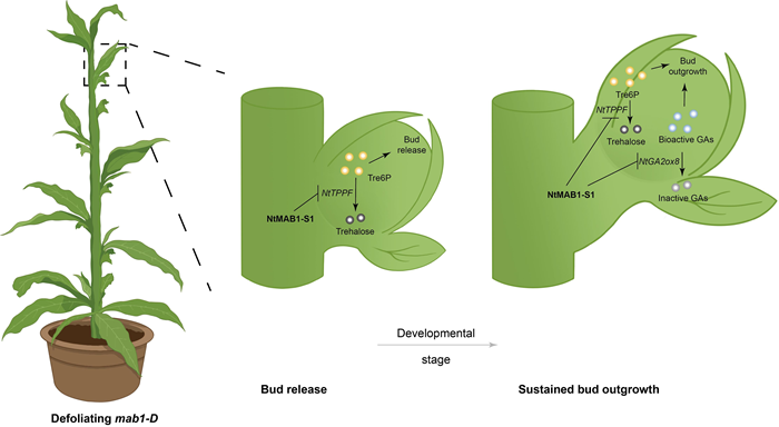 该研究鉴定出烟草分枝关键调控因子NtMAB1-S1,其在腋芽基部高表达,通过抑制下游基因海藻糖磷酸酶和赤霉素氧化酶,显著提升植物内源海藻糖-6-磷酸和活性赤霉素水平,从而激活休眠腋芽,促进芽释放与持续生长。该研究不仅揭示了腋芽破休眠生长的核心分子机制,更为未来作物理想株型精准调控和遗传改良提供新靶点。