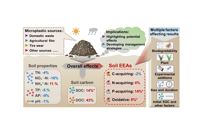 微塑料作为一种日益突出的环境污染物,广泛存在于各类土壤环境中,其能够通过干扰土壤胞外酶(如碳、氮、磷获取酶及氧化酶等)活性,进而影响土壤生态系统多功能性。但是,微塑料影响土壤胞外酶活性的普遍规律及潜在机制尚不明晰。