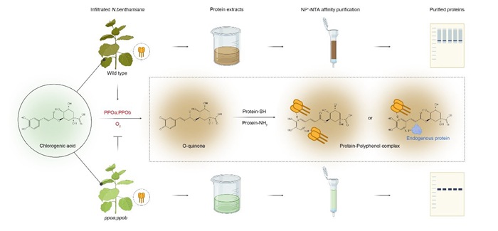 以新冠病毒刺突蛋白和流感病毒血凝素蛋白为模型进行验证。结果显示,在双突植株中,两种重组蛋白的纯化回收率分别提高70%和40%。进一步分析发现,经简单镍柱纯化后,植物自身杂蛋白污染比例由63.4%降至3.2%,以绿原酸为代表的多酚残留也显著下降。总体来看,该研究从源头上解决了植物表达体系中长期存在的“易氧化、难纯化”难题,为植物源重组蛋白药物的规模化、高质量生产提供了关键技术支撑。