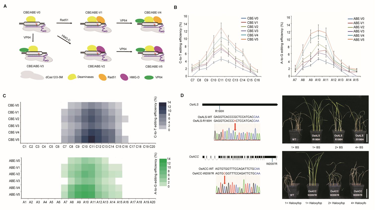研究团队利用蛋白质工程策略,通过构建5个不同版本碱基编辑器并分别对其进行编辑效率系统评估。其中一种结合了两个特定功能单元的架构表现最优,能显著提升腺嘌呤、胞嘧啶碱基编辑效率,并扩大碱基编辑窗口。在水稻稳定转化株系中可将原有碱基编辑效率分别提升4.78倍和3.35倍,胞嘧啶转胸腺嘧啶和腺嘌呤转鸟嘌呤的最高编辑效率分别达到32.35%和38.24%。同时,研究团队利用该系统成功创制抗除草剂水稻种质。该研究为作物基因功能解析和精准遗传改良提供了重要工具和技术支撑。