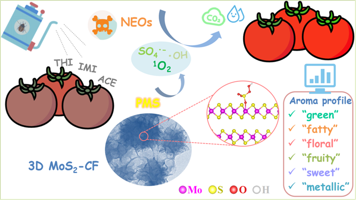 新烟碱类农药在番茄等作物表面的残留问题不仅威胁食品安全,更会干扰果实香气代谢通路,导致特征性风味物质损失。该研究通过精准调控纳米材料晶体生长过程,成功构建具有矢车菊形貌的二硫化钼催化剂,通过降低电子转移能垒,显著提升催化体系效率。根据理论计算和实验分析,首次揭示了该体系以单线态氧为主导的非自由基反应机制,这种新型反应模式具有更强的目标选择性,15分钟内即可实现96.5%的农药降解率,较二维催化剂效率提升超52%,同时完整保留了番茄的挥发性香气成分。经气相色谱-嗅觉检测-质谱联用技术分析发现,包括己烯醛、2-异丁基噻唑等在内的关键香气物质,保留率超过98%。该研究“高效去农残、精准保品质”的技术特征可为农产品采后风味品质安全保障提供绿色高效的解决方案。