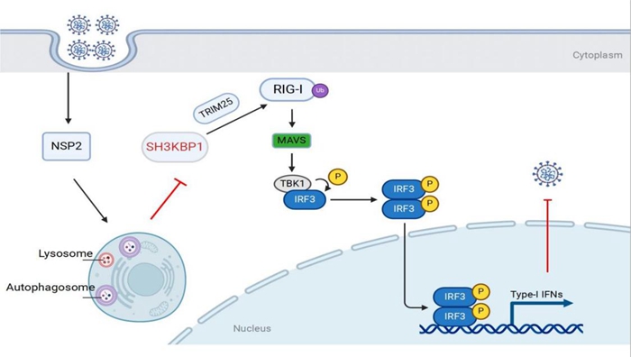 该研究首次发现宿主SH3结构域激酶结合蛋白1具有正调控抗病毒天然免疫的功能,并可以增加干扰素的产生,从而抑制猪繁殖与呼吸综合征病毒复制。研究同时发现,猪繁殖与呼吸综合征病毒的非结构蛋白2,具有促进SH3结构域激酶结合蛋白1通过自噬途径降解,从而拮抗其抗病毒天然免疫的作用,促进病毒复制。该研究为寻找新的抗病毒靶点和探索病毒复制机制提供了理论支持,并为猪繁殖与呼吸综合征病毒的致弱策略提供了新的思路。