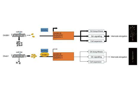 该研究鉴定到调控棉花果枝长度的重要株型主效基因GhSBI1,发现该基因主要通过抑制节间木质部细胞伸长来抑制果节的伸长,并抑制赤霉素合成和信号转导途径的关键基因表达,导致活性赤霉素含量降低和信号转导受阻,从而棉花节间伸长受到抑制。研究成果为棉花株型的分子改良提供了基因资源和种质材料。