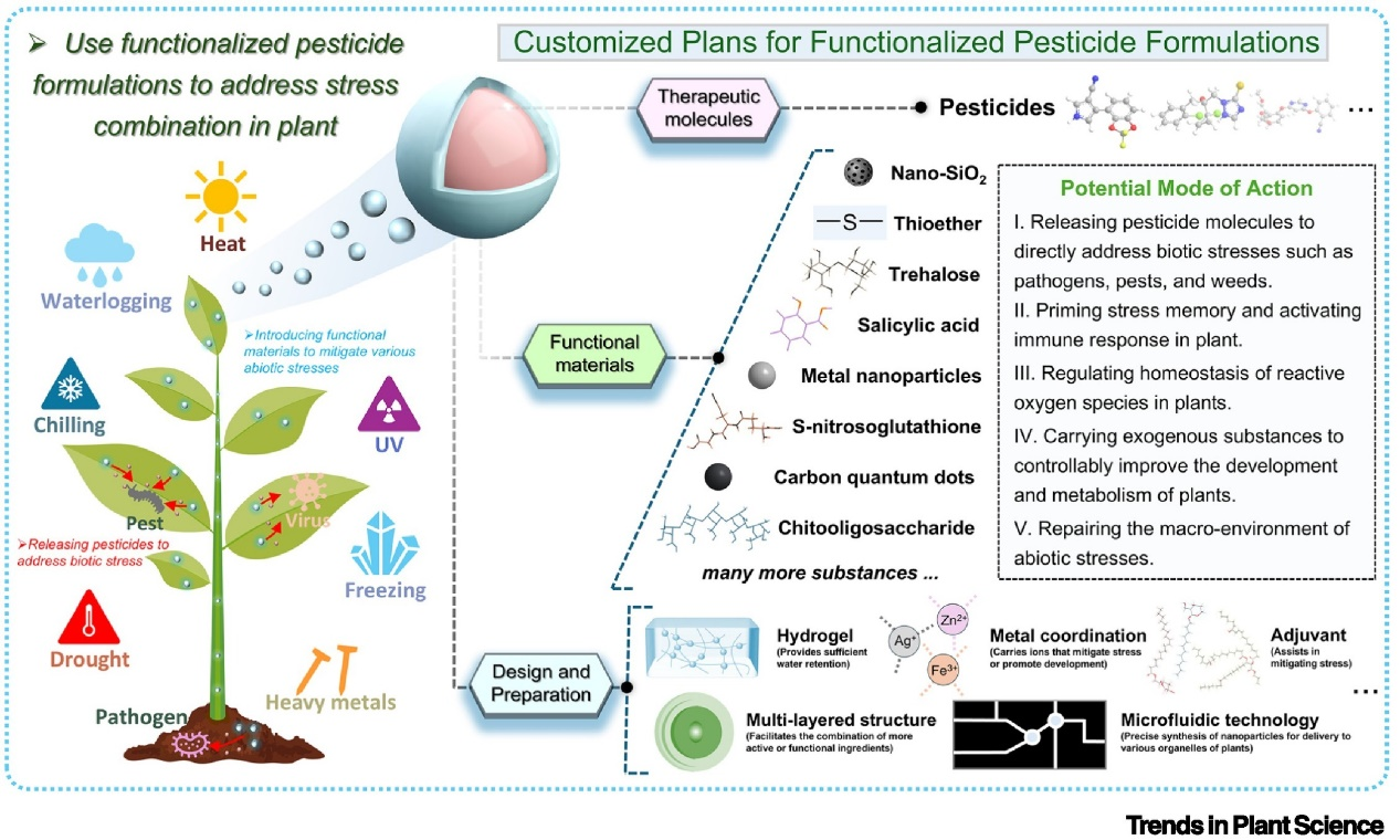 近日,中国农业科学院植物保护研究所农药分子靶标与绿色农药创制创新团队应邀在Cell Press旗下著名期刊Trends in Plant Science(IF: 17.3)撰写题为《‘Microscopic engineering vehicles’ for plants under stress combination》的观点。考虑到全球气候风险加剧对植物生长带来的不良影响,该论文提出了利用功能化农药制剂同时应对生物及非生物组合胁迫的科学观点,为解决植物受到的组合胁迫危机提供了创新思路。