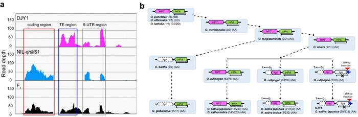 科研团队以南方野生稻和栽培稻“滇粳优1号”(DJY1)为亲本,构建了仅在第一条染色体上包含野生稻片段的近等基因系(NIL-qHMS1)。对不同的遗传群体基因型鉴定,发现杂种一代的花粉中DJY1基因型的花粉败育。实验证实,该近等基因系qHMS1位点由HPT和HPA两个基因组成,分别发挥毒药和解毒功能,选择性地败育DJY1基因型的花粉。转录组分析发现,毒药基因可能通过影响淀粉合成相关基因的表达进而导致DJY1型花粉败育。进一步研究发现,该位点与实验室前期发表的“自私基因”位点在调控杂种花粉育性方面具有遗传累加效应。