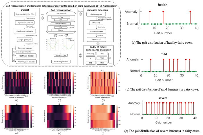 该研究首次将时间序列异常检测框架引入奶牛跛行识别,创新了利用时间序列重构的半监督自动编码器模型,通过对奶牛步态周期信号进行降维重构,识别出步态时间序列中因早期跛行导致的异常步态信号,减轻了奶牛个体差异和牧场非结构化测量环境对识别模型精度的影响,提高了奶牛早期跛行识别精度,有利于跛行疾病的早发现、早控制,及时恢复生产力,降低奶牛被动淘汰率。该成果为畜禽生理健康智能感知技术研究提供了新方法。