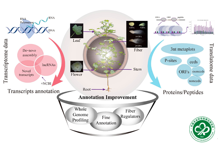 近日,中国农业科学院棉花研究所李付广研究员团队利用基于参考基因组的转录组从头组装技术和核糖体图谱分析技术,对棉花基因组注释进行了更新,揭示了控制棉花纤维发育转录后调控新机制,对棉花纤维品质的遗传改良具有指导意义。相关研究成果以“Transcriptional and translational landscape fine-tune genome annotation and explores translation control in cotton”为题在线发表在国际著名综合性期刊《尖端研究杂志(Journal of Advanced Research)》(IF=12.823)上。